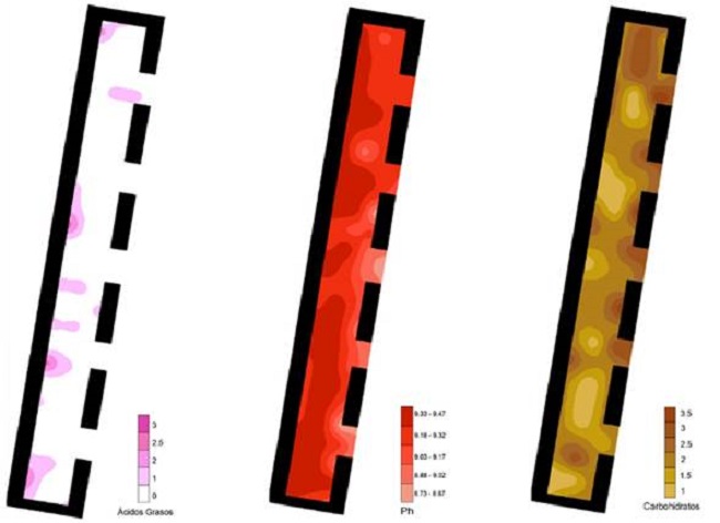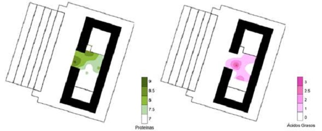 Es interesante notar que los ácidos grasos, al igual que las proteínas, se concentran en las banquetas, lo cual reforzaría la propuesta del servicio y consumo de alimentos en esos espacios más que su preparación, ya que no se encontró evidencia alguna de un fogón dentro de la estructura, lo que sugeriría que la cocción se realizaba en otra parte, posiblemente al exterior de la misma.