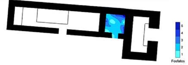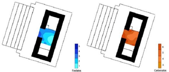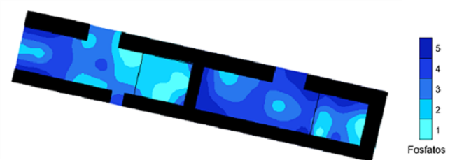 En el mapa de distribución de fosfatos (Figura 4), se puede notar que el valor más alto se presenta en las esquinas u orillas de la estructura, donde, en general, se concentran más los residuos, lo que concuerda con lo encontrado en los estudios etnográficos y arqueológicos mencionados. El valor de fosfatos más alto se encuentra en los pisos de ambos cuartos y en la banqueta oriente, mientras que la banqueta poniente tiene un enriquecimiento de fosfatos en concentraciones más bajas que el resto de la estructura, a excepción de tres esquinas, quizá porque las actividades realizadas en ella fueron menos intensas y/o frecuentes, lo que enriqueció poco esta área.