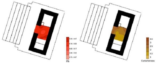 El pH del cuarto presenta valores altos, lo cual, al igual que en el caso de la Estructura GZ1, puede estar relacionado con la ceniza que se encontró como parte del ritual de terminación (Figura 27). Asimismo, la excavación detectó una mancha negra en la esquina noreste, donde los valores de pH son más altos, quizá producto de la quema del piso durante el mismo ritual (Tsukamoto y López Camacho, 2011: 146). Los carbohidratos, al igual que los otros residuos, muestran un patrón de enriquecimiento en las orillas, con las concentraciones más altas al norte y oriente del cuarto (Figura 28).