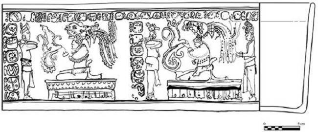 Es interesante notar que las áreas con valores altos de residuos en esta estructura están concentradas en la entrada y cerca de la banqueta norte, la cual es más grande que la banqueta sur, lo que, junto con los enriquecimientos, hablaría de su importancia ritual. La distribución de los residuos químicos, como ácidos grasos y proteínas, se puede relacionar con la función ritual de GZ1, así como la escena iconográfica plasmada en un vaso cerámico con pseudoglifos, encontrado como parte del ajuar funerario del Entierro 1 en esta misma estructura (Figura 22); en él se observan rituales de fuego realizados por dos personajes ricamente ataviados con tocados, cada uno en una banqueta diferente, emitiendo lo que parece ser una flama (Tsukamoto et al., 2015: 207).