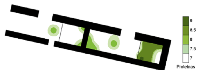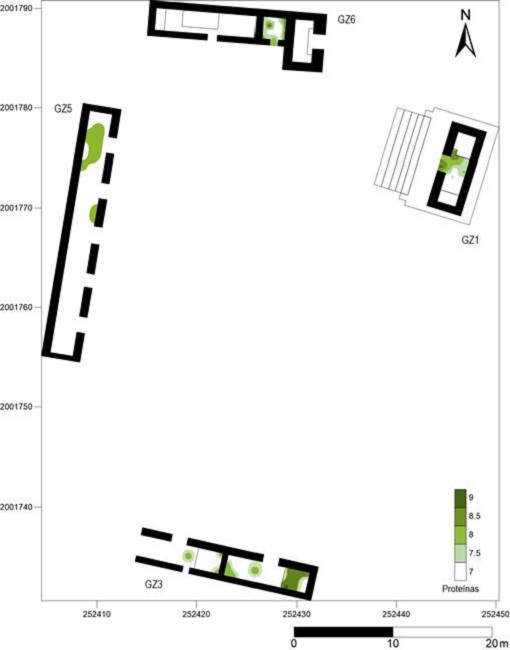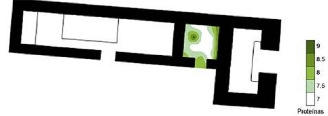 En el caso de las proteínas, se puede notar que se concentran en el sector norte de la estructura y sólo una pequeña cantidad cerca del tercer vano, de sur a norte (Figura 12). Esta distribución no es clara, debido a que los otros valores no apoyan la idea de que GZ5 haya sido destinada a preparar o consumir alimentos.