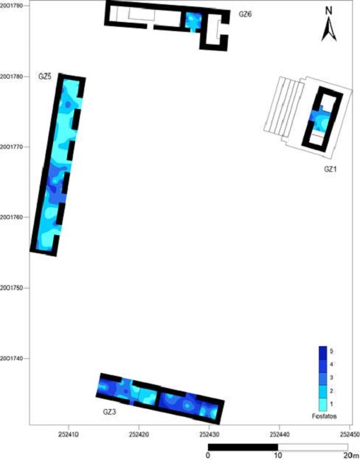 Los niveles de fosfatos en el área muestreada son en general bajos, a excepción de la entrada al templo y la parte norte de la estructura (Figura 16); asimismo podemos notar que, al igual que GZ5, presenta un piso con altas concentraciones de carbonatos (Figura 17), lo cual se puede explicar por su función ritual como templo y por las restringidas actividades que ahí se llevaban a cabo, lo que preservó el piso.