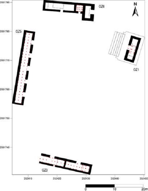 La Estructura GZ3 se muestreó en toda su extensión incluyendo la banqueta del cuarto oriente, donde se observó el recubrimiento de estuco totalmente degradado, mientras que la banqueta poniente de la Estructura GZ5 no pudo ser muestreada debido a que, en la temporada anterior, su superficie fue consolidada con lajas de piedra (Tsukamoto y López Camacho, 2018: 29).
