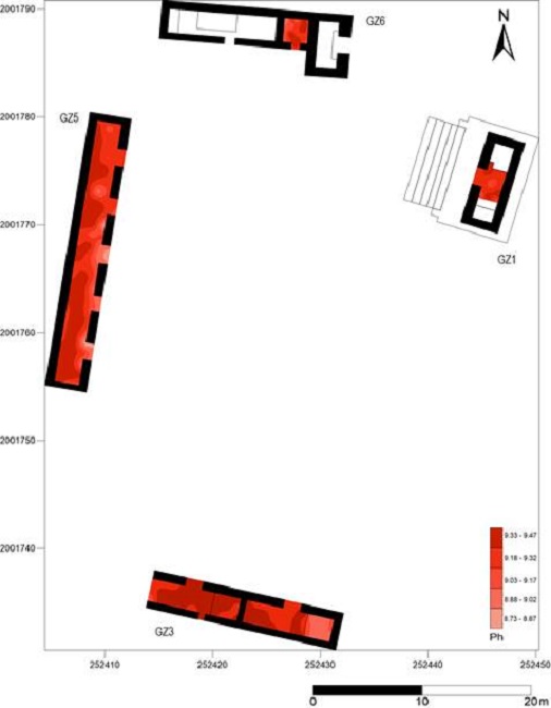 De igual manera, llama la atención la abundante presencia de ácidos grasos, pues es uno de los indicadores químicos que más fácilmente se pierden en el área maya. La variación de pH en todas las estructuras fue mínima, con ligeras diferencias entre ellas, teniendo un promedio de 9.28, un mínimo de 8.73 y un máximo de 9.46; sin embargo, los valores más altos están en la Estructura GZ3 (Figura 8). La variación del pH no es significativa, por lo que se podría afirmar que el valor alcalino es una mezcla entre los componentes del piso y las cenizas del ritual de terminación que se documentó en todas las estructuras. Los valores bajos de pH en la banqueta oriente pueden deberse al mal estado de conservación del recubrimiento de estuco.