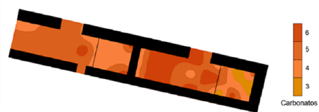 En contraste, los niveles de carbonatos en general son altos, a excepción de algunos puntos cercanos a los accesos de la estructura; también se puede observar una ligera disminución de ellos al centro de la misma (Figura 11). De lo anterior, podemos inferir que el aumento de carbonatos indica que las actividades realizadas no fueron intensivas, lo que permitió conservar alta su proporción. Otra explicación que hay que tener en cuenta es el factor del tiempo, ya que quizá este piso fue construido en una época posterior al de las otras estructuras, lo que le impidió enriquecerse de la misma forma.