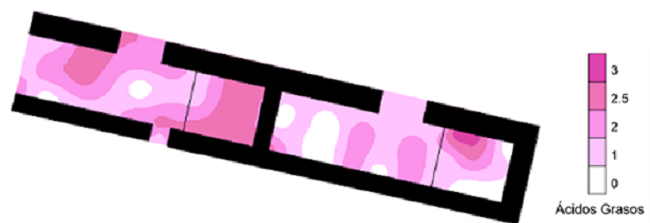 Asimismo, se observa un enriquecimiento de ácidos grasos en bajas concentraciones y en lugares específicos: al centro y en las esquinas del muro poniente, algunos detrás de las jambas y en una sección al centro (Figura 13). La distribución no parece tan aleatoria y podría deberse a que en esos lugares estuvo algún objeto con grasas animales o vegetales, o bien, resinas de madera que dejaron impregnada la superficie (Barba y Ortiz, 1992: 79), lo que se explicaría por la presencia de vigas que sostenían una techumbre de material perecedero.