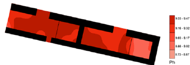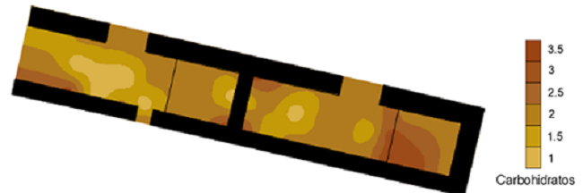Los valores más altos de pH se encuentran en la mitad poniente; sin embargo, como ya se mencionó, no presentan cambios significativos entre ellos, y los valores más bajos pueden relacionarse al deterioro químico del piso y, por lo tanto, a la pérdida de su alcalinidad (Figura 14). En el caso de los carbohidratos (Figura 15), hay algunos valores más altos que los encontrados en GZ3, y se encuentran cerca de los vanos de la estructura, así como en la sección norte.
