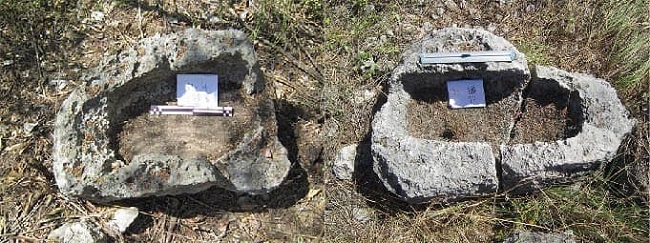 Las muestras arqueológicas para su análisis por fluorescencia de rayos X se extrajeron de ocho metates (Tabla 2) del sitio, en apariencia fabricados con el mismo tipo de caliza. Como complemento petrográfico mediante microscopía se elaboraron láminas delgadas de cuatro de los metates (Figura 2).