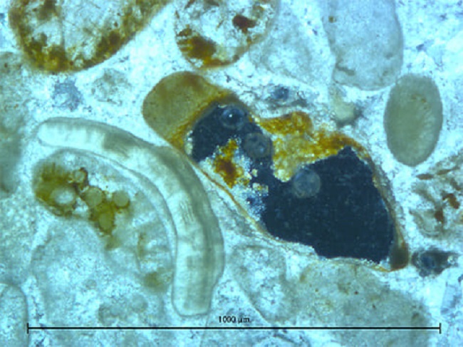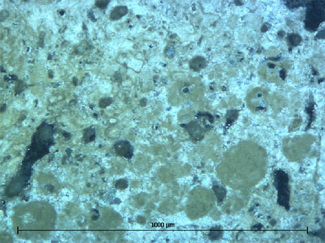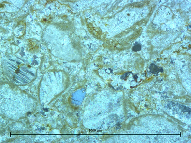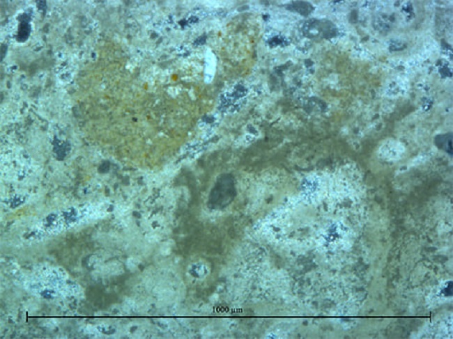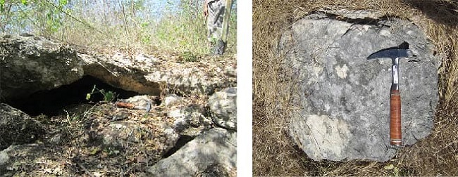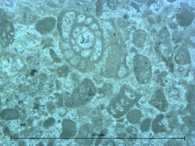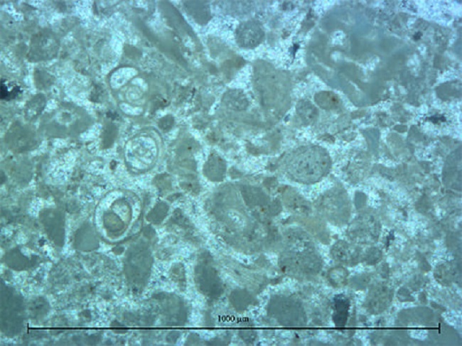 Muestras recolectadas (Figura 3) en el mismo sitio arqueológico de Sihó y en otros lugares de la formación geológica, se han clasificado como mudstone y boundstone con variación a wackestone,9packstone10 y puntualmente hacia grainstone, con significativa correspondencia con litotipos identificados por Cardoso et al. (2004) y Miranda (2005). A diferencia de las rocas paleógenas de la formación Chichén Itzá, no se ha detectado a penas la presencia de dolomita cristalina, pero sí una mayor presencia de rocas fosilíferas.