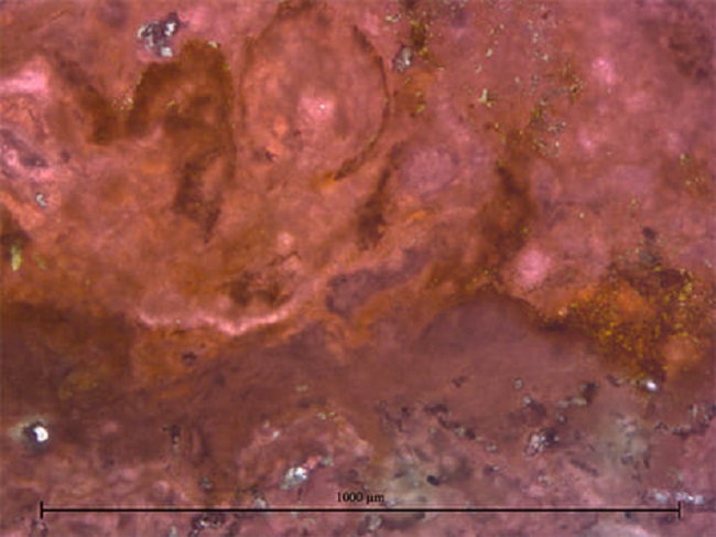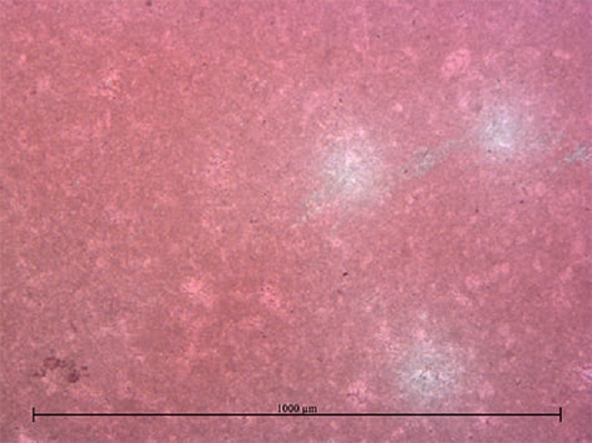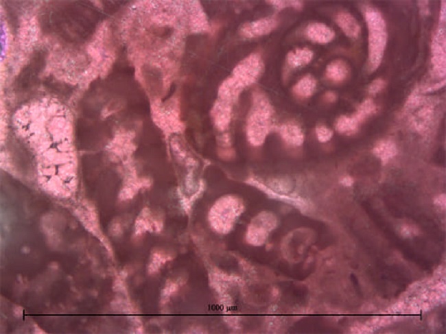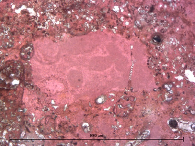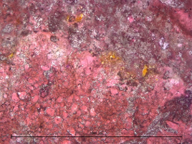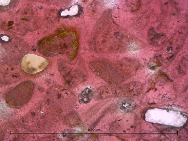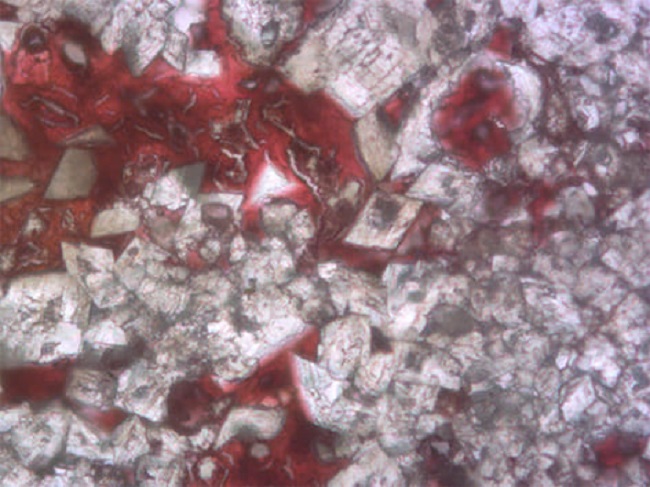 Para la diferenciación de contenidos en carbonato cálcico y/o dolomita, se procedió a la tinción de determinadas láminas delgadas de referencia. El sistema utilizado fue la solución de rojo de alizarina en una concentración de 0.2 g/100 ml de ácido clorhídrico al 1.5% en 1 l de agua destilada (Adams, MacKenzie y Guilford, 1997).