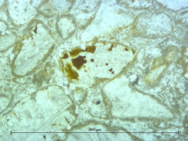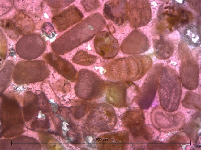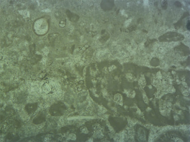 Las formaciones Maastrichtianas del Cretáceo superior están formadas principalmente por rocas de anhidrita translúcida, con cuerpos intercalados de caliza dolomítica cristalina (López, 1977). Dichas formaciones contienen intercalaciones calcáreas criptocristalinas de tamaño fino a medio, microfósiles, oolitos y pseudolitos, que dan lugar a calcarenita (López, 1977). Estas rocas también han sido reportadas como calizas tipo Petén del Cretácico Superior (Aguilar, 1979a; 1979b; López, 1977; Miranda, 2005; Virgen y Baca, 1988). Esta descripción de materiales coincide con muestras (Figura 3) que colectamos en la falla de Ticul y en algunos afloramientos en las colinas ubicadas al sur, clasificadas por nosotros principalmente como grainstone5 con base en su textura depositaria bien cementada, puntualmente silicificada y/o dolomitizada, con contenido erosionados de rocas calcáreas, fósiles y oolitas (Sánchez y Zamorano, 1993). También se ha reportado algún ejemplo de mudstone6 criptocristalino.