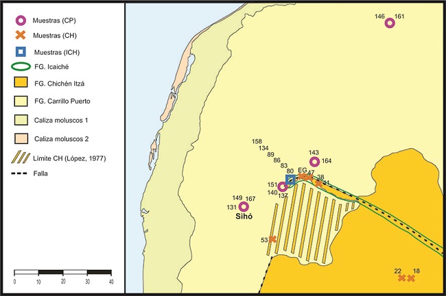 Sihó (15Q YN950681, Garza y Kurjack, 1980) se asienta sobre la formación geológica Carrillo Puerto (Figura 6) que ocupa las áreas norte, noroeste y oriente de la península de Yucatán, rodeando parcialmente de este a oeste y de norte a sur a la formación Chichén Itzá (Duch, 1988). El sitio se encuentra a unos 20 kilómetros al sureste del punto más cercano de esta formación, que se extiende hacia el sur y mitad norte de la península de Yucatán y que coincide con el límite occidental más extremo de la falla de la sierra de Ticul. Dicha sierra está asociada a la formación Chichén Itzá y al miembro subyacente Icaiché y recorre el norte peninsular en dirección sur-suroeste (Figura 6)(Marín, Pacheco y Méndez, 2004).