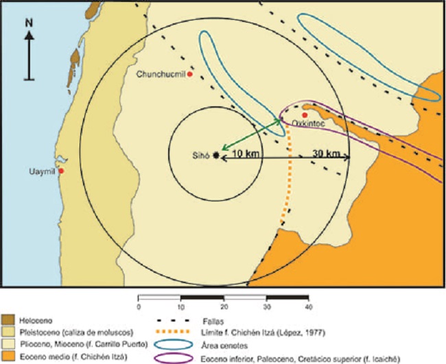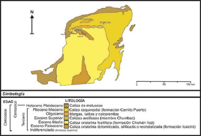 Los suelos calcáreos que conforman la mayor parte de la península de Yucatán se generaron a partir del Cretácico Superior (100.5 - 66.0 Ma),4 a lo largo del Paleógeno (66.0 - 23.03 Ma) y Neógeno (23.03 - 2.58 Ma), siendo dominantes las formaciones del Eoceno (56,0 - 33,9 Ma), Oligoceno (33,9 - 23,03 Ma), Mioceno (23.03 - 5.333 Ma) y Plioceno (5.333 - 2.58 Ma) (Dutch, 1988; Flores, 1974). En comparación con los materiales más modernos del Neógeno, las rocas superficiales cretácicas y paleogénicas tienen una mayor dureza que se desarrolla hacia el interior por acción atmosférica (Duch, 1988). Durante el Cuaternario (2.58 Ma - presente) se formó el caliche calcáreo que recubre gran parte de los sustratos emergidos del Cretácico, Eoceno, Oligoceno, Mioceno y Plioceno (López, 1977), igual que el desarrollo del litoral costero peninsular.