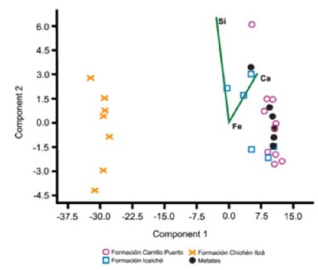 Según el gráfico de componentes principales (Gráfica 1), la población de referencia geológica que más resalta la constituyen muestras de la formación Chichén Itzá, colectadas al sur-sureste de la sierra, entre Maxcanú, Calkiní, Labná, Sayil y Oxkintok. La segunda población de materiales de referencia que destaca proviene de la formación geológica Carrillo Puerto, recogidos en el sitio de Sihó, en Kopomá y en Dzityá, al noroeste de Mérida. La última población observable, aunque con valores más distanciados, es la de los pedreros de la cara norte de la falla de Ticul, vinculados principalmente a los afloramientos del miembro geológico Icaiché. Si nos atenemos a la distribución que plantea el gráfico de componentes principales (Gráfica 1), observamos una mayor asociación elemental de los metates asociada con la muestra de la formación Carrillo Puerto, aunque aparece un individuo algo más alejado de la tendencia del grupo.