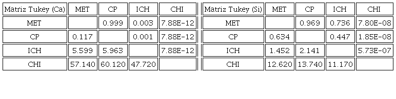 Como contraste estadístico practicamos una matriz de Tukey (Tabla 5) que expone, en los valores ubicados en su parte superior derecha, una mayor probabilidad de asociación porcentual del silicio o el calcio en los metates con la muestra de referencia de la formación Carrillo Puerto, seguida por la de Icaiché en el caso del silicio con una probabilidad positiva mayor 5% (0.05) de formar parte de la misma población. Sin embargo, respecto al calcio, esta probabilidad queda descartada al estar por debajo del p-valor necesario para que se cumpla con la hipótesis poblacional de relación con la formación Icaiché. Para con la muestra de referencia de la formación geológica Chichén Itzá, la probabilidad poblacional con la muestra arqueológica no se cumple con ninguno de los elementos, al desarrollar un p-valor mucho menor al 5% (0.05).