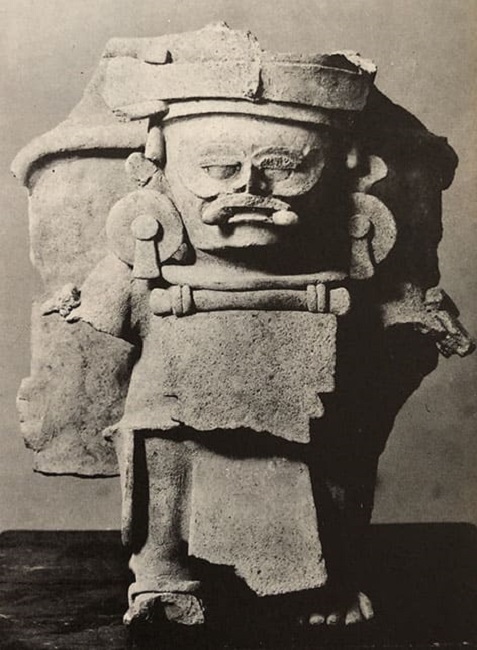 La imagen del incensario efigie que aparece en The Ancient Maya es una buena expresión de las modificaciones graduales en las percepciones del Posclásico Tardío (Figura 1). Se incluye en la primera edición, en la referida lámina que, según el pie de figura, es un incensario encontrado en las cercanías de Chichén Itzá e ilustra la alfarería del periodo Decadente y más tarde, el periodo de la desintegración (Morley, 1946: lám. 85b). Consta de un personaje, de pie, el cual se elaboró en alto relieve, aunque la parte trasera está adherida a una urna. Algunos elementos de su atavío también se ven en relieve, y por los dientes exagerados se aprecia que es una deidad. Aunque la superficie está lisa ahora, por las semejanzas con las figuras de cuatro incensarios de Chichén Itzá que conservan restos de color, se puede imaginar que originalmente había algunos detalles del atavío.2 Este incensario es el que Brainerd (Morley y Brainerd, 1956: lám. 85b) incluyó en la tercera edición del libro, aprovechándose del mismo pie de figura, a pesar de que había eliminado el periodo Decadente de su esquema cronológico. Para Proskouriakoff, los incensarios de este tipo fueron parte de la ocupación tardía de Mayapán, una manifestación de la muerte de la cultura maya. Los describió como “gaudily painted censers made in the images of gods… From the censer images, we get a clear impression of the credulous, inartistic and militaristic character of the age, which contrasts sharply with the scope and serenity of earlier Maya traditions” (Proskouriakoff, 1955: 86). En la cuarta edición de The Ancient Maya, la referencia es neutral. El pie de la ilustración le informa al lector que se trata de un ejemplo de “Late Postclassic pottery from the northern Lowlands… [an] effigy incensario found near Chichen Itza” (Morley, Brainerd y Sharer, 1983: fig. 12.22).