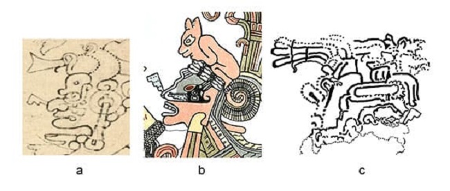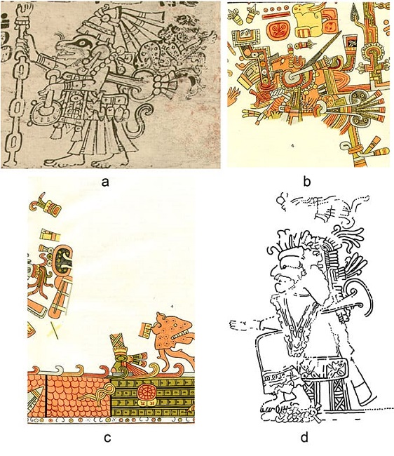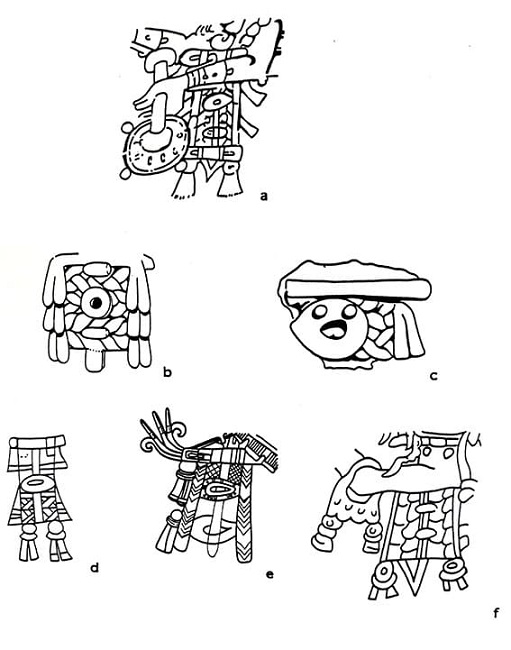 El tercer ejemplo de las conexiones con el Posclásico Tardío se halla en el collar del tlacuache en la página 26a del manuscrito y los de las figuras efigie que suelen anexarse a los incensarios Tases de Mayapán (Paxton, 1980; 1986; 1991). Además, se incluye en los incensarios efigie de otros lugares y en algunas pinturas del periodo. En el códice (Figura 4a), la forma básica es el rectángulo, largo y vertical, que está en el pecho. Consta de una varilla horizontal en la parte superior, desde la cual cuelga una unidad de trenzas entrelazadas. Encima de éstas hay una forma ovalada con punto, que se conoce frecuentemente con el nombre de oyohualli, y en los lados, las líneas verticales parecen ser las sogas que pasan encima de la varilla para suspender el rectángulo. Éste remata en la parte inferior con otra varilla horizontal y unas borlas; a lo largo de las cuerdas también hay borlas. Se puede apreciar que el collar cuelga de una sarta de cuentas, con las dos terminaciones amarradas en la parte trasera del cuello (véase también Figura 3a).