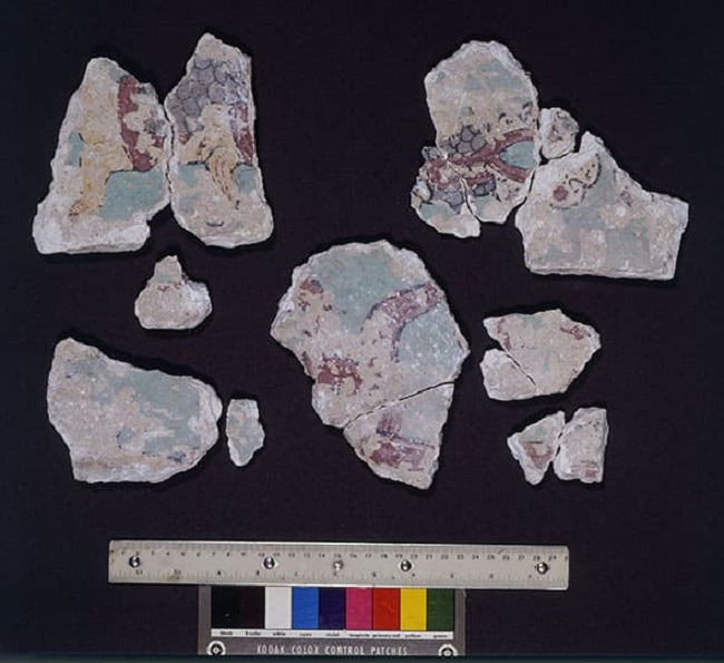 Por otra parte, el arte del Posclásico Tardío abarca ejemplos cuyo valor estético, al considerar la destreza de su mano de obra, no sólo no es decadente, sino que argumenta una asociación del Códice de Dresde con el periodo. Se halla evidencia de ello en los fragmentos de una pintura mural (Figura 6), que según Quirarte (1982) y Hammond (1982) (véanse también el pie de frontispicio), se atribuye a las pinturas de Santa Rita Corozal. Fueron colectados por Thomas Gann, y posiblemente son los únicos restos de estas obras.20 Había en Nueva York, en la colección del Museum of the American Indian (antes Heye Foundation) unos fragmentos de pintura con una anotación de su procedencia de Santa Rita. Quirarte (1982: 58) concluyó que, por el fondo azul y la representación de un pez, eran parte de la mitad este de la pared norte, donde el diseño también aparece.21
