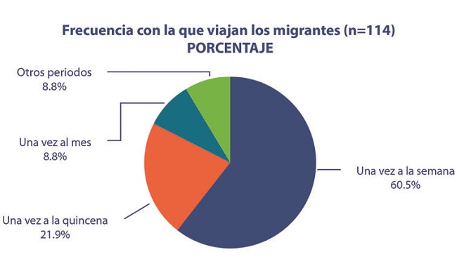 En cuanto a los factores de vulnerabilidad que arrojó la encuesta, es relevante aclarar que aquí la migración se consideró como uno de dichos factores. El tipo de migración que se realiza en Yucatán y en especial en los municipios de Tahdziú y Chacsinkín es del tipo regional, ya que migran a destinos cercanos a sus localidades, como se mencionó anteriormente. También se considera migración pendular porque no permanecen en dichas zonas, sino que en ciertos momentos regresan a su comunidad de origen; como se puede observar en la Gráfica 2, el 60.5% retorna semanalmente a sus hogares. Respecto a los motivos por los que actualmente viajan los 114 migrantes, el 99.1% lo hace por motivos laborales mientras que el 0.9% lo hace por otros motivos.