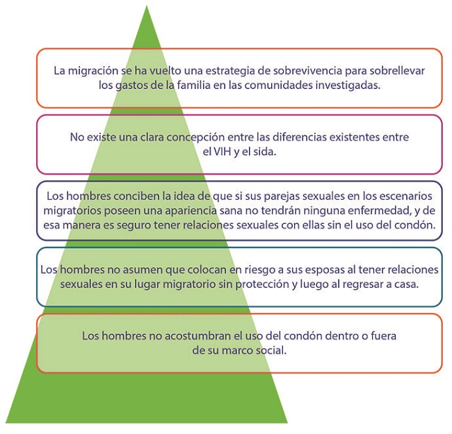 Los comportamientos de los hombres migrantes son considerablemente distintos cuando están dentro y fuera de la comunidad. Pese a que en ambas la variable de vivir en riesgo está presente, cuando se hallan en el destino migratorio, el riesgo se potencializa. Estar lejos de la inspección de los miembros de la comunidad permite que los individuos se sientan en mayor libertad para tener comportamientos inusuales, que podrían no ser aceptados en el lugar de origen (Leyva et al., 2004: 58). En este sentido, la frecuencia con la que tienen contactos sexuales con personas desconocidas de las cuales ignoran su estado de salud, incrementa. Tomando lo anterior como premisa, el cambio de comportamiento que se busca es “fomentar el uso del condón con parejas distintas con quien cohabitan en la comunidad”, esto para proteger a la mujer de la infección por VIH, y también considerando que bajo sus concepciones culturales no es aceptado el uso del condón con la pareja formal.