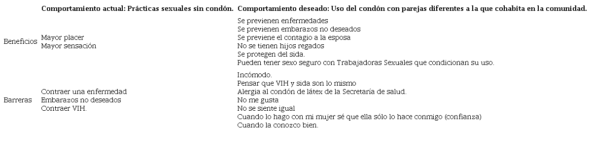En el caso de los hombres migrantes se encontraron varias barreras para lograr el cambio de comportamiento. La más importante de éstas fue “cuestionar la idea de la confianza en las parejas sexuales distintas con la que cohabita en la comunidad”. Ésta resultó ser uno de los pilares significativos detectados en el diagnóstico, pues se halló que los migrantes otorgaban igual valor a sus cónyuges que residían en la comunidad como a las parejas que veían periódicamente en los escenarios migratorios, esto, independientemente del hecho de que ellas sostuvieran relaciones sexuales con otras personas. En este sentido, se observó que existía la percepción de que el VIH era una enfermedad que se podía detectar a simple vista, por lo que fue indispensable concientizar acerca de que el VIH no se ve. Relacionado con la anterior, fue necesario profundizar en remover la idea de que el VIH y el sida son lo mismo. El mensaje que se buscaba transmitir e incorporar como parte del proceso de concientización para lograr el uso del condón en todas sus relaciones sexuales era que el VIH aunque no tiene manifestaciones visibles como el sida, puede ser transmitido y desarrollar problemas graves de salud. A la par se tuvieron que remover dos ideas más: que el “uso del condón es menos placentero que cuando no se usa” y que “los condones gratuitos son de menor calidad y causan sensación alérgica”.