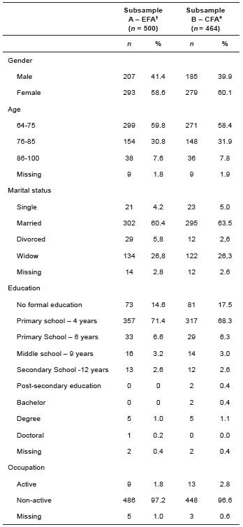 In this cross-sectional and observational study, a non-probabilistic and convenience sampling technique was used, whose subjects were recruited as part of a larger research project. Participants were 964 community-dwelling older people, aged between 64 and 99 years (M= 74.4, SD=7.0), 392 (39.6%) were male and 572 (57.7%) were female. Most were married (n=612; 61.8%), and 26.3% were widows (n=261). Primary school (4 years) educational level was found in 70% of the sample (n=696).