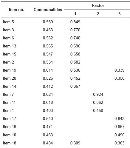 The Principal Axis Factoring (PAF) method was used for a first exploratory data analysis (with oblimin rotation and without forcing the previous number of factors), aiming to understand how data were naturally grouped. From this analysis, items 4, 8, 9 and 12 were excluded due to their low communalities (lower than 0.30). Later, a second exploratory factor analysis was performed and the results showed that items were grouped into three factors and all items (excluding items 18, 19 and 20) were loaded into a single factor, with values above 0.30, as indicated in Table 2.