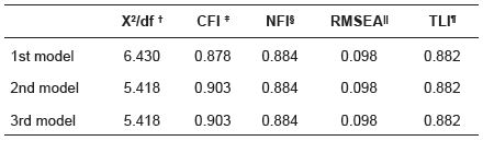 The Confirmatory Factor Analysis (CFA) was used to test the model suggested by the EFA, which included three inter-correlated latent variables (F1 to F3) and 16 observable variables. All items loaded onto their proposed factors (Model 1). An analysis of the modification indices was conducted and the model was re-specified through correlation between errors from items 5 and 6, 3 and 5, and this modified model (Model 2) showed a better fit for the data(34).