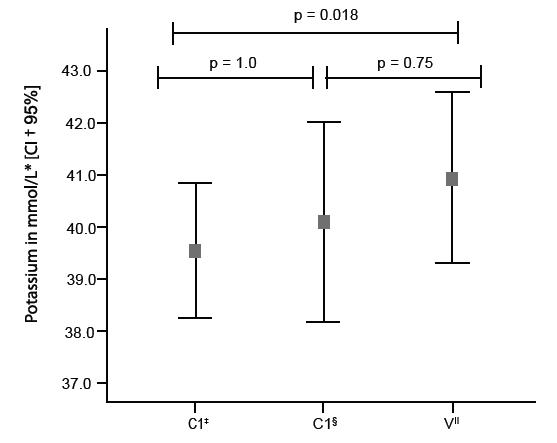 Multiple comparisons were performed with potassium in the three moments of the experiment according to the Bonferroni method, as showed in Figure 1.