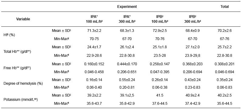 The minimum degree of hemolysis found in the experiment phases with IPA was 0.06%, at infusion rate of 100mL/h; the maximum degree of hemolysis was 0.81%, found at infusion rate of 300mL/h. The degree of hemolysis in the IPB have varied from 0.06%, in the experiment phases at infusion rate of 100 mL/h, and 0.83%, at infusion rate of 300mL/h, which corresponded to the moment C1 at the data collection time. Potassium presented minimum value of 39.1mmol/L and maximum value of 43.7mmol/L in the IPA; and minimum of 37.4mmol/L and maximum of 44.5mmol/L in the IPB.
