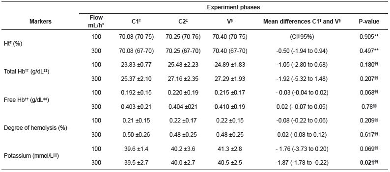 The percentage of hematocrit, the total hemoglobin concentration, the free hemoglobin and the degree of hemolysis did not present significant variation in the three moments of the experiment, regardless of IP and infusion rate. Despite of the statistical significance, free hemoglobin increased from 0.298±0.20g/dL in C1, 0.312±0.21g/dL in C2, and 0.31±0.20g/dL in V (P=0.064). Potassium concentration increased during the experiment from 39.5±2.0 mmol/L in C1; 40.1±3.03 mmol/L, in C2; 40.9±2.5mmol/L, in V (P < 0.01).