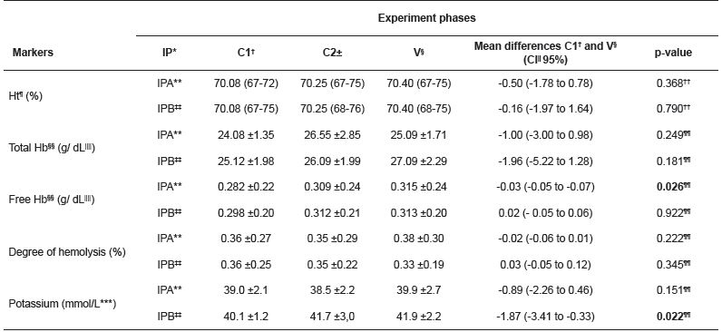 There was no statistically significant difference in hematocrit, total hemoglobin concentration and degree of hemolysis, regardless of the IP used in the experiment. The free hemoglobin (P=0.026) and potassium (P=0.022) concentration presented significant increase when the RBC were submitted to IPA and IPB, respectively.Regarding the additional variables, the laboratory temperature ranged from 21.2ºC to 26.9ºC and the relative air humidity remained in the mean of 56.7 ± 2.9% during the experiments. The temperature of the blood components varied from 19.3ºC to 25.3ºC during the phases.