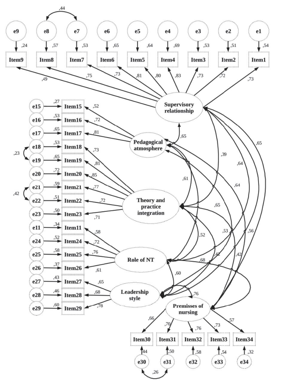Figure 1 shows the confirmatory factor analysis (CFA) fit indexes of the two models. Through the two proposed models, these differences were studied. Supervisory relationship (factor 1: items 1-9), pedagogical atmosphere on the ward (factor 2: items 15-17), role of nurse teacher (factor 3: items 11, 24-26), leadership style of the ward manager (factor 4: items 27-29), premises of nursing on the ward (factor 5: items 30-34), and role of theory and practice integration (factor 6: items 18-23) were items in model.