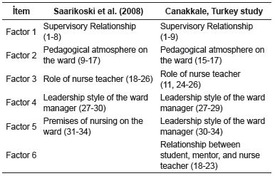 As a result of item analysis, it was determined that item-total correlations of four items (10, 12, 13, 14) were <0.30, and those items were removed from the scale which then totaled 30 items and was composed of six subscales. We have shown this study, and the study of Saarikoski’s (2008) item subscales, in Table 1.