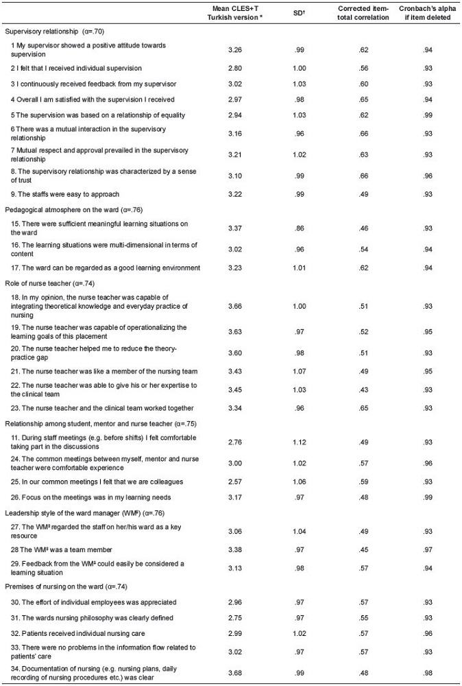 Validity and reliability of the Clinical Learning Environment, Supervision and Nurse Teacher (CLES+T), Turkish version1