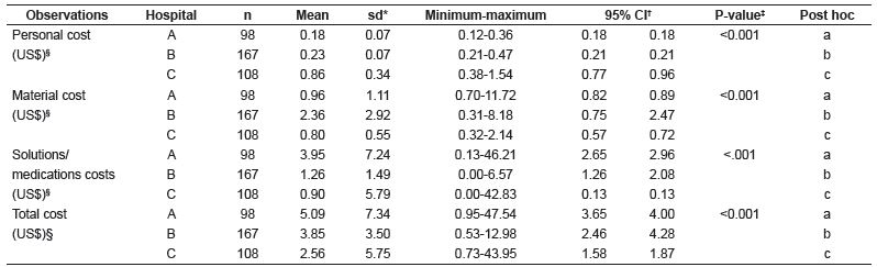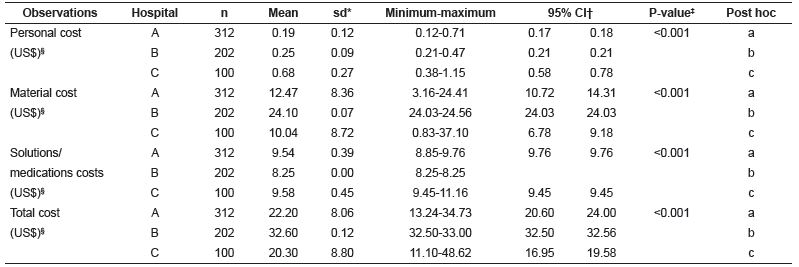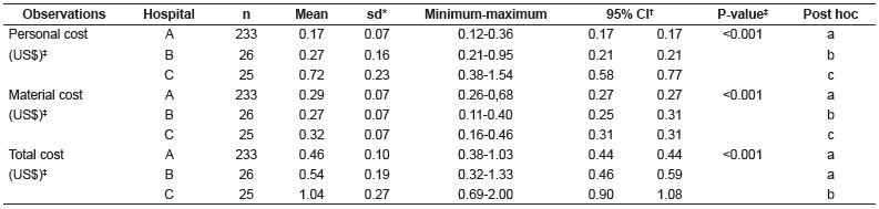 The “installation of hemodialysis arteriovenous fistula access” was performed exclusively by nurses in hospital C (100%), predominantly by nurses in hospital B (92.31%) and frequently by nursing technicians (63.09%) in hospital A. Table 2 shows that the cost of material was the most important variable for the mean direct cost of this procedure in hospitals C (US$2.10, sd=0.91) and A (US$1.42, sd=0.16) and the cost of solutions/medications in hospital B (US$2.20; sd=1.89), due to the higher consumption of heparin for blood anticoagulation during extracorporeal circulation. There was a statistically significant difference in the personnel, solutions/medication and total cost variables only in hospital A.