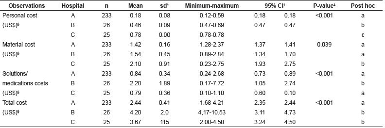 As shown in Table 3, hospital B presented the highest mean cost with solutions/medications (US$2.36, sd=0.72), related to the addition of 19.1% potassium chloride ampoules (10 ml ampoule: US$0.14) in the gallon of polyelectrolyte solution. There was a statistically significant difference in all variables (personnel, material, solutions/medication and total costs) only in hospital A.