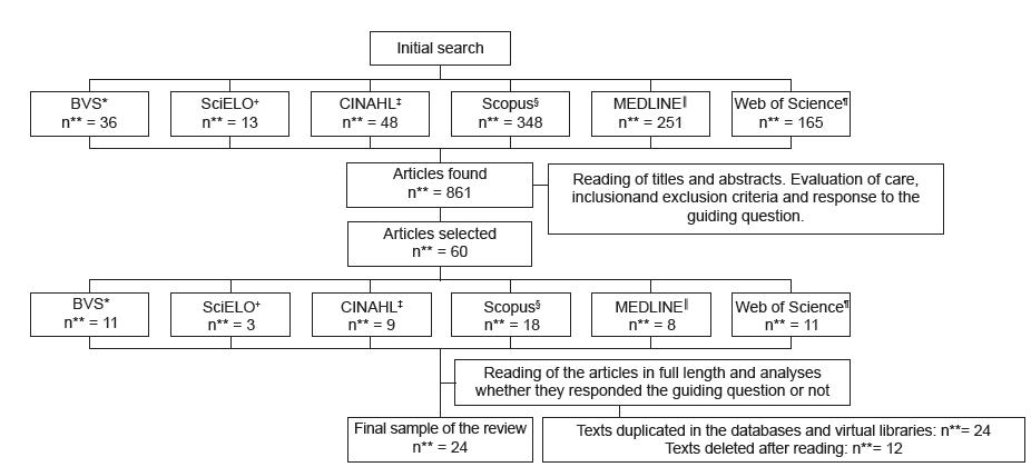 The bibliographic search was carried out based on the guiding question researched in the following virtual libraries: Scientific Electronic Library Online (SciELO) and Virtual Health Library (VHL), with access to the Specific Database of Nursing (BDENF); Spanish Bibliographical Index of Health Sciences (IBECS); Latin American and Caribbean Literature in Health Sciences (LILACS); Virtual Campus of Public Health (CVSP - Brazil); Index Psychology - Technical-scientific journals; and other databases: Cumulative Index to Nursing and Allied Health Literature (CINAHL); Medical Literature Analysis and Retrieval System Online (MEDLINE) via PubMed; SciVerse Scopus; Web of Science.