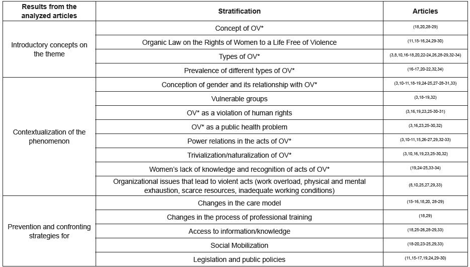 The articles were analyzed to identify similar information shared in their results and discussions. To better understand the data, three analytical categories were prepared: Introductory concepts on the theme; Contextualization of the phenomenon and Prevention and confronting strategies. The synthesis of these elements allowed the organization of the ideas that composed the discussion, in order to characterize OV in daily care (Figure 3).