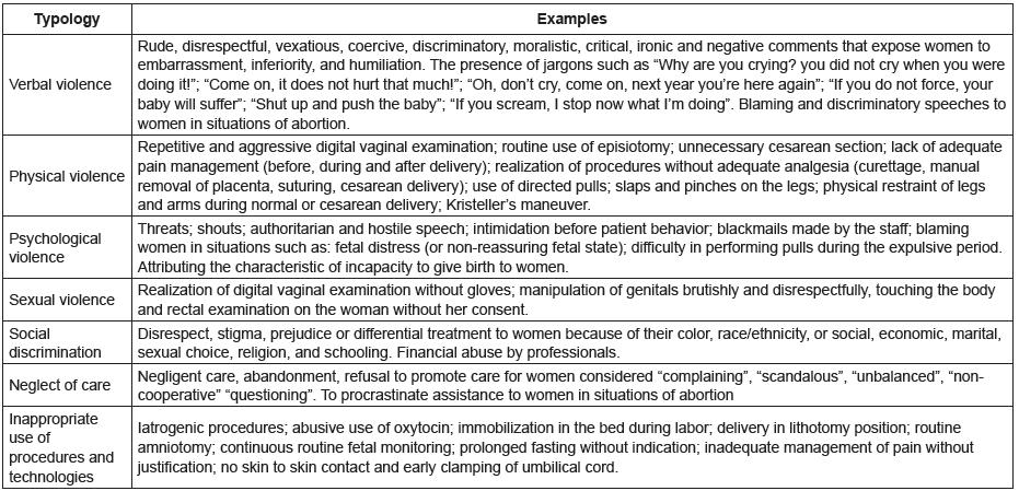 To understand OV, the contextualization and typification of this phenomenon are initially presented in the different care scenarios. The theoretical revision made it possible the conception of OV as a phenomenon recognized through different types of violence that may occur in the context of gestation, delivery, puerperium, as well as in situations involving assistance for cases of abortion, post-abortion and reproductive cycle18,20,28-29.
