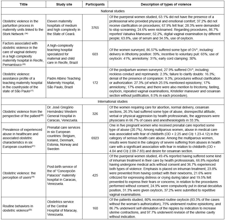 The synthesis of the findings of the studies allowed the identification of characteristics of OV as an obvious event expressed as negligent, reckless, omissive, discriminatory and disrespectful acts practiced by health professionals and legitimized by the symbolic relations of power and the technical-scientific knowledge that naturalize and trivialize its occurrence in the obstetric scenario. Thus, VO depicts a violation of human rights and constitutes a serious public health problem.