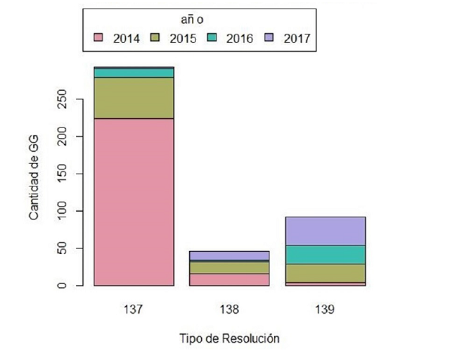 La distribución porcentual del tipo de gran generador de acuerdo a su respectiva resolución es la siguiente: el 68% pertenece a la Resolución 137 (Countries y Barrios Cerrados), casi un 11% a la Resolución 138 (Galerías comerciales, Hipermercados, cadenas de comida rápida y Hoteles de 4 y 5 estrellas), y un 21 % a la Resolución 139 (Industrias). Se observa que el 57% de los Planes de Gestión se presentó durante el primer año en que se instrumentaron las Resoluciones, pero además se puede identificar que de ese valor, el 92% fueron Planes de Gestión presentados por Countries y Barrios cerrados. Junto al recambio de autoridades en la Provincia y en varios de los municipios involucrados, en el año 2016 descienden notablemente las presentaciones de Planes de Gestión. No obstante, en el año 2017 se nota un incremento de la presentación de Planes de Gestión respecto de la caída del año anterior, pero ahora resultan preponderantes los pertenecientes a la Resolución 139 (Industrias).