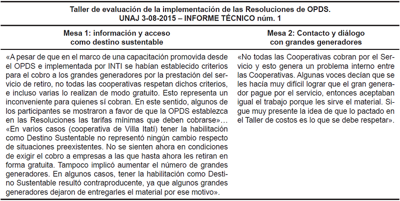 Se observó durante ese taller la demanda de las cooperativas más consolidadas para que OPDS intervenga regulando el cobro de los servicios. Los funcionarios y técnicos del OPDS sostuvieron la posición de no mediar sobre los acuerdos que se establecen entre grandes generadores y destinos sustentables. Al ser entrevistado para este trabajo, el encargado del Área de Cooperativas del OPDS manifestó que dicho organismo no puede involucrarse en dichas cuestiones. Si bien reconoció que desde el organismo recomiendan a los grandes generadores elegir a cooperativas como destinos sustentables, sospecha que si además les impusieran la obligatoriedad del pago por los servicios prestados, los grandes generadores preferirían contratar empresas privadas.