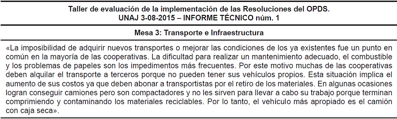 Las cooperativas de recuperadores urbanos interesadas en transportar y tratar los residuos reciclables de las industrias también explicitaron esta problemática en oportunidad del taller antes citado: