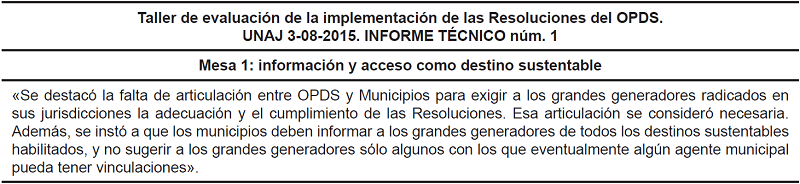 Con la sanción de las Resoluciones se creó un espacio de diálogo entre las partes involucradas (OPDS, grandes generadores, destinos sustentables) que consistía en reuniones periódicas, pero las mismas se han venido diluyendo y han perdido regularidad. Ese espacio fue mencionado por varios entrevistados como un ámbito indispensable para procurar mejoras en la implementación de las Resoluciones. Los talleres organizados desde proyectos universitarios de investigación y transferencia cuyos informes y registros se emplearon como fuente, tuvieron el mismo reconocimiento. Esperamos que este trabajo sea también un renovado aporte en tal sentido.