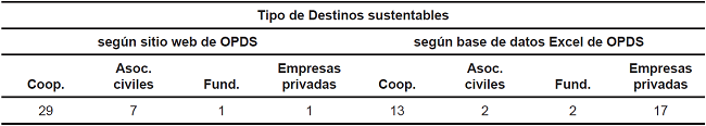 De acuerdo a la información que suministra OPDS en su sitio web, hasta diciembre de 2017 se habían otorgado 38 habilitaciones a destinos sustentables, de los cuales 29 eran cooperativas, siete asociaciones civiles, una fundación y una empresa privada. Ahora bien, al analizar la base de datos Excel suministrada por el propio OPDS, sólo 13 de esas 29 cooperativas aparecen como destino sustentable en los planes de gestión de los grandes generadores, mientras surgen de allí 17 empresas privadas como destino sustentable (aunque sólo una de ellas estaría habitada como tal). El contraste entre las dos fuentes del OPDS (sitio web y registro en base de datos Excel de los planes de gestión) respecto de los tipos de destinos sustentables se aprecia en la Tabla 5.