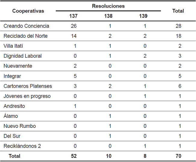 Los recuperadores urbanos agrupados en cooperativas se fueron identificando en Argentina como los encargados de gestionar los residuos reciclables, insertándose como un actor que abarca la generación de empleo, la organización barrial y las problemáticas ambientales (Angélico y Maldovan, 2008)8. Las Resoluciones de OPDS constituyen un ejemplo de ello al reconocer explícitamente que los recuperadores urbanos organizados en cooperativas pueden participar como Destinos Sustentables que brindan servicios a los grandes generadores. Para poder tener dicho reconocimiento los interesados deben inscribirse en el Registro de Tecnologías del OPDS (regido por la Resolución núm. 367/10). Con el fin de facilitar la inscripción de las cooperativas de cartoneros a dicho Registro, el OPDS introdujo la Resolución núm. 20/14 que elimina y simplifica los trámites para obtener la habilitación. En efecto, en los considerandos de esta última Resolución se menciona