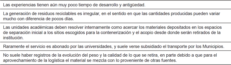 Las Universidades Nacionales quedaron excluidas de las Resoluciones, no obstante lo cual en los últimos años varias han comenzado a llevar a cabo sistemas de separación interna de residuos, y han establecido contacto con cooperativas de recuperadores para el retiro (un primer registro de estas experiencias puede encontrarse en AA.VV, 2016: Jornada Universidades y Desarrollo Sustentable). Un indicador de la potencialidad que tiene este tipo de experiencias, es la recientemente creación de la Red de Universidades Argentinas para la Gestión Ambiental y la Inclusión Social (UANGAIS) y en la que se han definido representantes por región (CIN, 2018). A continuación se describen brevemente tres casos y luego se presentan sus características principales en un cuadro.