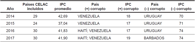 Entre la problemática de corrupción que afecta a los países de ALC se cuentan los escándalos que involucraron a altas autoridades públicas, como el caso de los «Panamá Papers» y los sobornos de la constructora «Odebrecht». Ello consistentemente ligado a los resultados de alta percepción de corrupción presentes en diferentes indicadores internacionales, como los medidos por la organización Transparencia Internacional –TI–. Estas herramientas han sido criticadas por varios países de la región, principalmente, Ecuador, Bolivia, y Venezuela (América Economía, 2012), (El Universo, 2013), (Hough, 2016), (Panamá América, 2013).