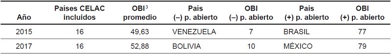 Sin embargo, con estos datos, es posible deducir de forma cuantitativa los limitados avances regionales respecto a la transparencia y prevención de la corrupción: a) una percepción de corrupción en aumento con un IPC promedio de 41/100 en el 2017, siendo el puntaje más alto para la región de 74/100 para Barbados y Uruguay; b) en cuanto a presupuesto abierto un avance promedio de 49,63/100 en el 2015 a 59,88/100 en el 2017, teniendo el puntaje más alto de la región México con la calificación de 79/100; c) una calificación promedio del 53% respecto al manejo adecuado de la lucha contra la corrupción por parte del gobierno, siendo el porcentaje más alto el de Honduras con el 55%; y, d) una evolución del ranking del derecho de acceso a la información que va en promedio del 89,81/150 en el 2014 al 91,86/150 en el 2017, siendo el puntaje más alto el de 136/150 para México en el 2017.